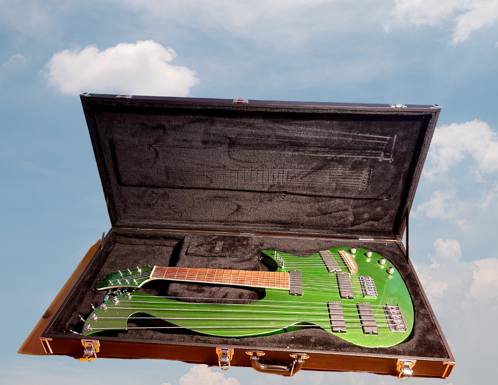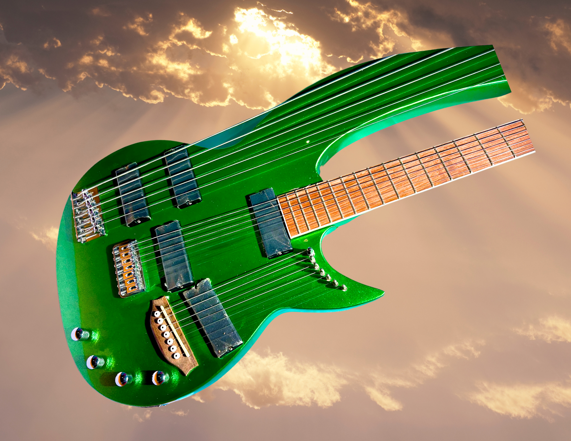 FIVE SUB HARP BASS STRINGS WITH TWO BEEFY BASS PICK UPS FOR GREAT ELECTRIC HARP BASS SOUND. CHROME BASS TUNING PEGS HOLD SOLID SUB HARP BASS TUNE. 30" TO 28" INCHES OF SUB BASS PLAYING SCALE.CHROME ADJUSTABLE TAIL PIECE ON SUB BASS STRING SIDE.